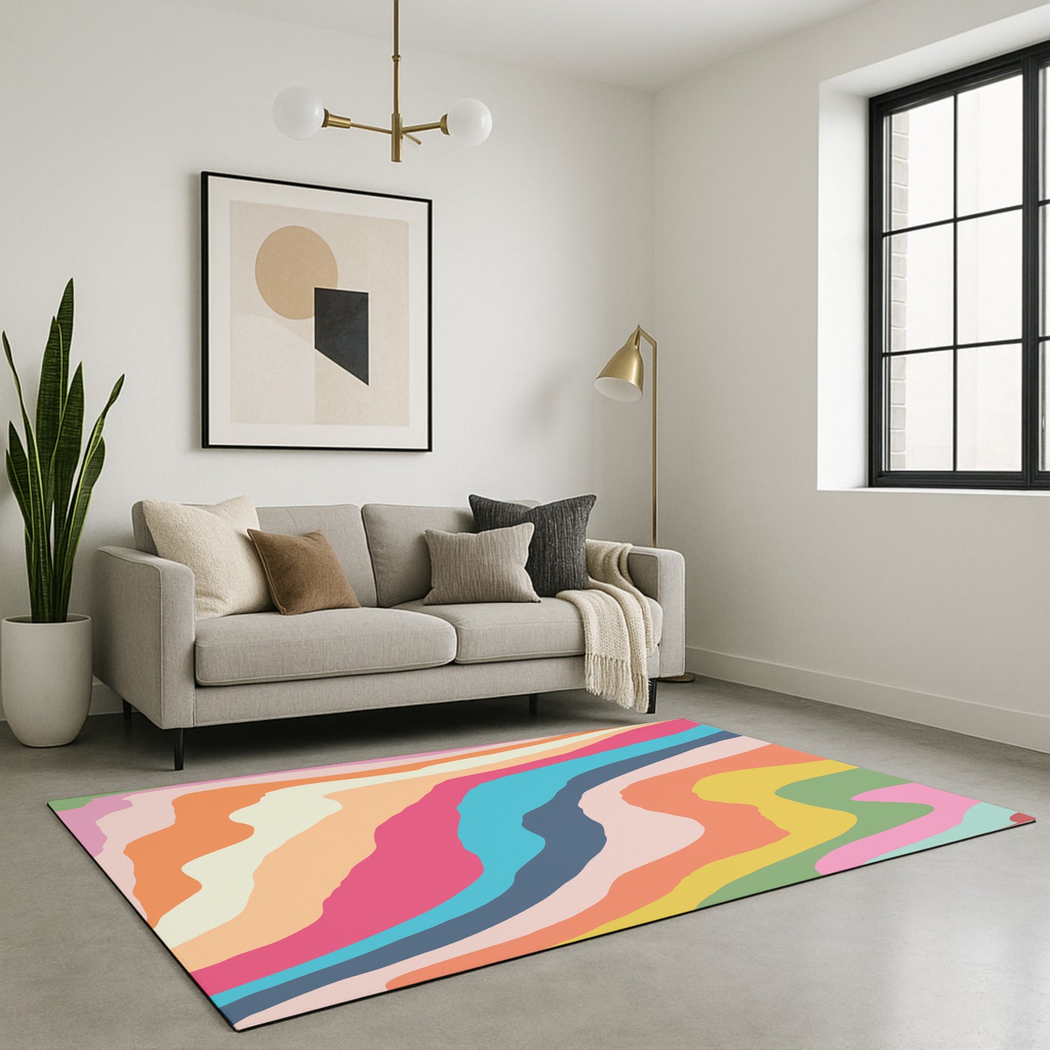 Swankymat rainbow abstract exercise mat and play mat in modern living room with grey sofa, black window, and wall art.